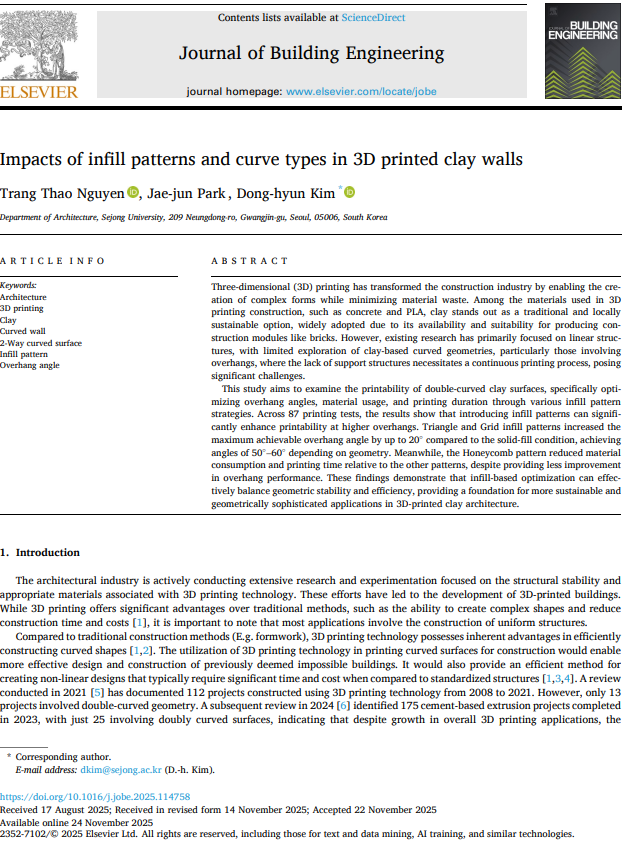 Three-dimensional (3D) printing has transformed the construction industry by enabling the creation of complex forms while minimizing material waste. Among the materials used in 3D printing construction, such as concrete and PLA, clay stands out as a traditional and locally sustainable option, widely adopted due to its availability and suitability for producing construction modules like bricks. However, existing research has primarily focused on linear structures, with limited exploration of clay-based curved geometries, particularly those involving overhangs, where the lack of support structures necessitates a continuous printing process, posing significant challenges.